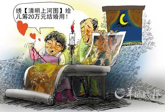 她通過媒體得知,跟她繡的一樣的《清明上河圖》十字繡曾拍賣出30多萬(wàn)元的價(jià)錢。她想給兒子在鄂州買一套房子結(jié)婚,愿意作價(jià)20萬(wàn)元賤賣這幅《清明上河圖》。