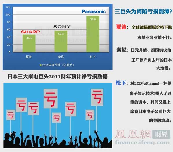據(jù)最新數(shù)據(jù)顯示,松下、索尼、夏普2011年業(yè)績虧損總額累計達1.6萬億日元(約合200億美元)。除此之外,東芝、日立等其他知名品牌,日子也并不好過,不是大幅虧損就是贏利急劇下降,尤其在顯示面板、電視機等利潤豐厚的王牌領(lǐng)域,日本大牌的虧損尤為驚人。