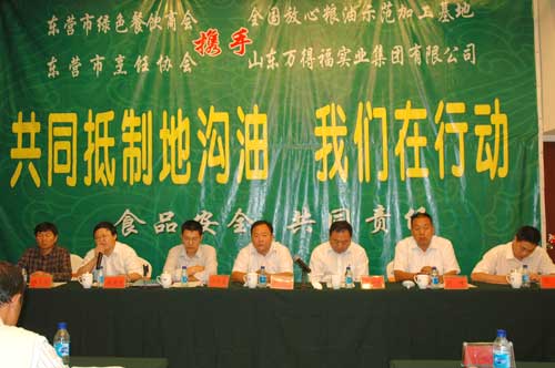 2011年9月15日上午,由東營(yíng)市綠色餐飲商會(huì)、東營(yíng)市烹飪協(xié)會(huì)攜手全國(guó)放心糧油示范加工基地山東萬(wàn)得福實(shí)業(yè)集團(tuán)有限公司發(fā)起的“共同抵制地溝油、我們?cè)谛袆?dòng)”新聞發(fā)布會(huì)及誓師大會(huì)在著名的東營(yíng)白云飯店隆重召開(kāi),出席這次大會(huì)的主要領(lǐng)導(dǎo)有:東營(yíng)綠色餐飲商會(huì)會(huì)長(zhǎng)唐金虎先生,秘書(shū)長(zhǎng)、齊魯園總經(jīng)理張若同先生,副會(huì)長(zhǎng)、心連心連鎖餐飲集團(tuán)創(chuàng)始人殷勇先生,副會(huì)長(zhǎng)、白云飯店總經(jīng)理高峰先生,副會(huì)長(zhǎng)、百盛園酒店董事長(zhǎng)王中華先生,副會(huì)長(zhǎng)、鴻豐餐飲總經(jīng)理常登舉先生,山東天河酒店集團(tuán)副總經(jīng)理燕軍先生,山東萬(wàn)得福集團(tuán)領(lǐng)導(dǎo)韓占武先生、高軍星先生,綠色餐飲商會(huì)常年法律顧問(wèn)、山東奮飛律師事務(wù)所主任高伯良先生。同時(shí),東營(yíng)電視臺(tái)、齊魯晚報(bào)、東營(yíng)001餐飲網(wǎng)、東營(yíng)區(qū)電視臺(tái)等傳媒界朋友,現(xiàn)場(chǎng)進(jìn)行了采訪報(bào)道。