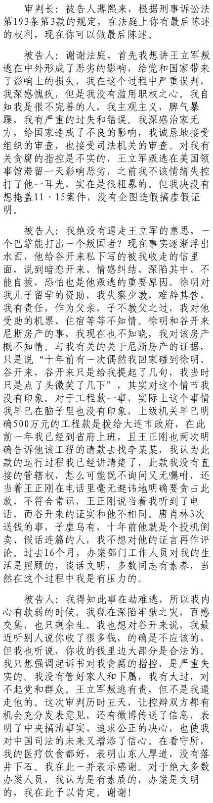 人民網(wǎng)北京8月26日電 今日,薄熙來(lái)受賄、貪污、濫用職權(quán)案庭審進(jìn)入第五天,開始進(jìn)行法庭辯論。在控辯雙方進(jìn)行辯論之后,被告人薄熙來(lái)進(jìn)行最后陳述。