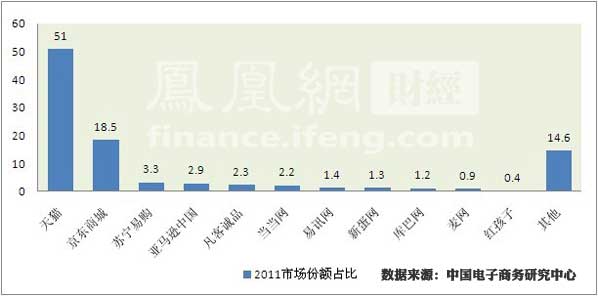 據(jù)中國電子商務(wù)研究中心監(jiān)測數(shù)據(jù)顯示,截至2011年12月中國B2C網(wǎng)絡(luò)購物市場上,排名第一的依舊是淘寶商城,占51%。京東商城名列第二,占據(jù)18.5%。蘇寧電器可謂傳統(tǒng)企業(yè)進(jìn)軍電商領(lǐng)域的代表,蘇寧易購在2011年發(fā)展較快,名列第三名,占3.3%。其他排名依次為:亞馬遜中國、凡客誠品、當(dāng)當(dāng)網(wǎng)、易迅網(wǎng)、新蛋網(wǎng)、庫巴網(wǎng)、麥網(wǎng)、紅孩子。