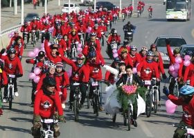 2013年1月1日是長沙市自行車旅游協(xié)會成員程敏大婚的日子。當天上午,他騎著新買的雙人單車迎親,同行的還有協(xié)會成員騎著99輛單車。長長的騎行隊伍讓這場婚禮成為一場自行車婚禮。